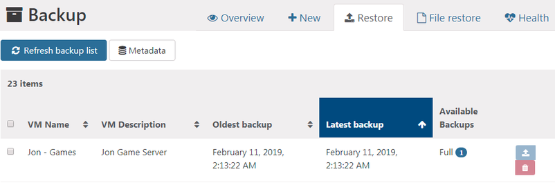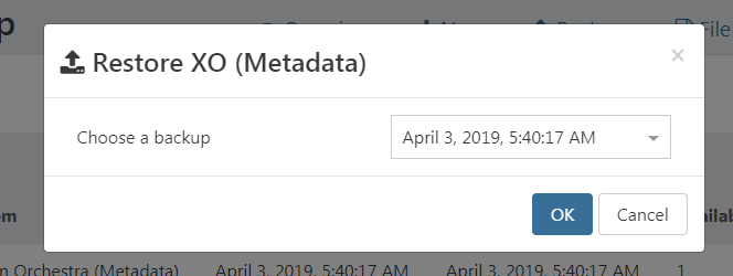 You can see both our Xen Orchestra config backup, and our pool metadata backup. To restore one, simply click the blue restore arrow, choose a backup date to restore, and click OK: